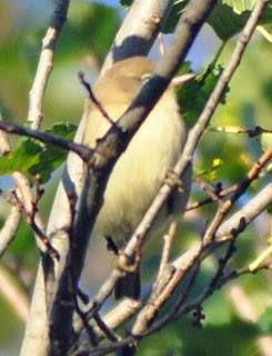 On the big day Saturday, Mary and I spotted a warbler way up in the elm grove at Butterfly Meadow south end. Hard to tell with sunlight splashed upon it, I asked Cindy Cage to take pictures of it. Viewing the pics last night, I ascertained the speices of this difficult call. I'll tell later if you want to have fun figuring it out.